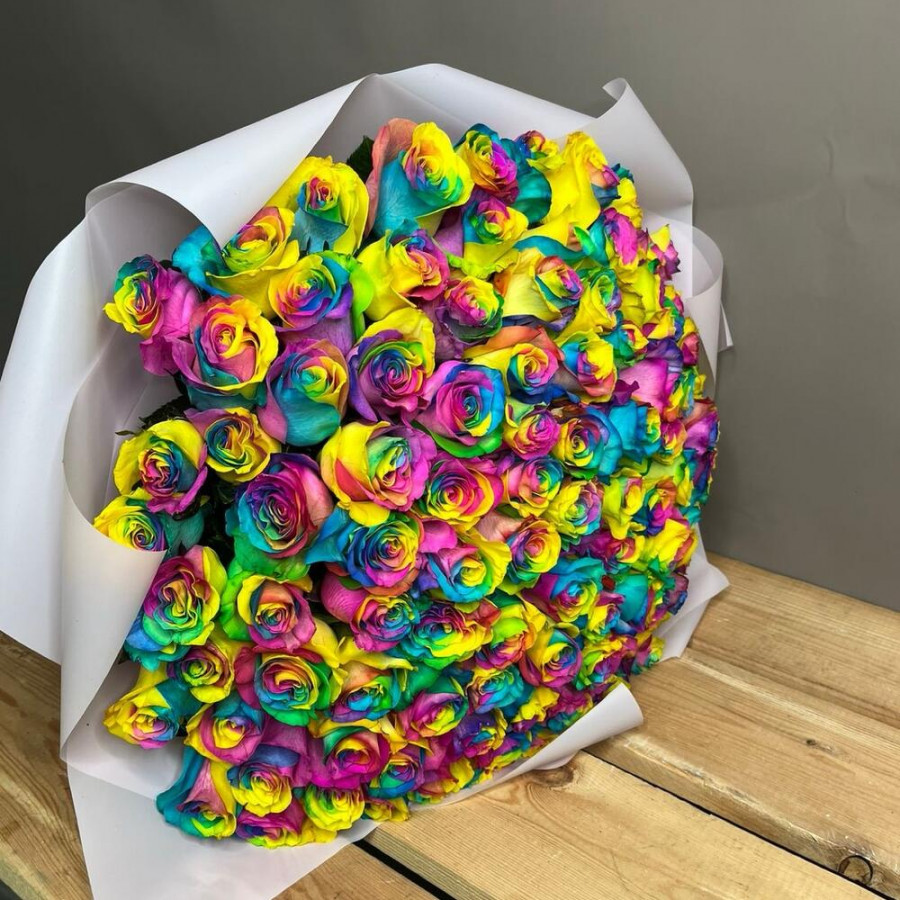 На фото букет из 101 радужной розы. В составе: роза 101 шт, дизайнерская упаковка 3 шт, атласная лента 3 шт, . Все цветы свежие и ароматные, букет красиво оформлен и отлично подходит для подарка. Доступна доставка цветов или самовывоз.