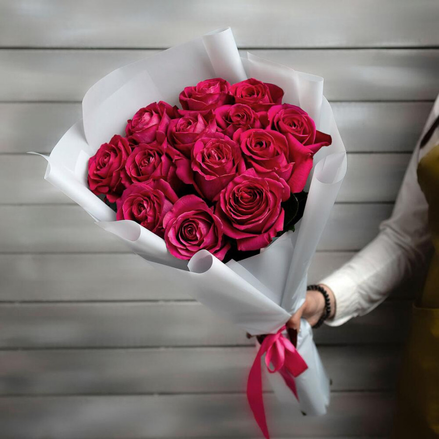 лента (за1м) - 1 шт. пленка прозрачная (за1м) - 1 шт. упаковка в ассортименте (за1м) - 1 шт. роза эквадор 5 малиновый - 13 шт.