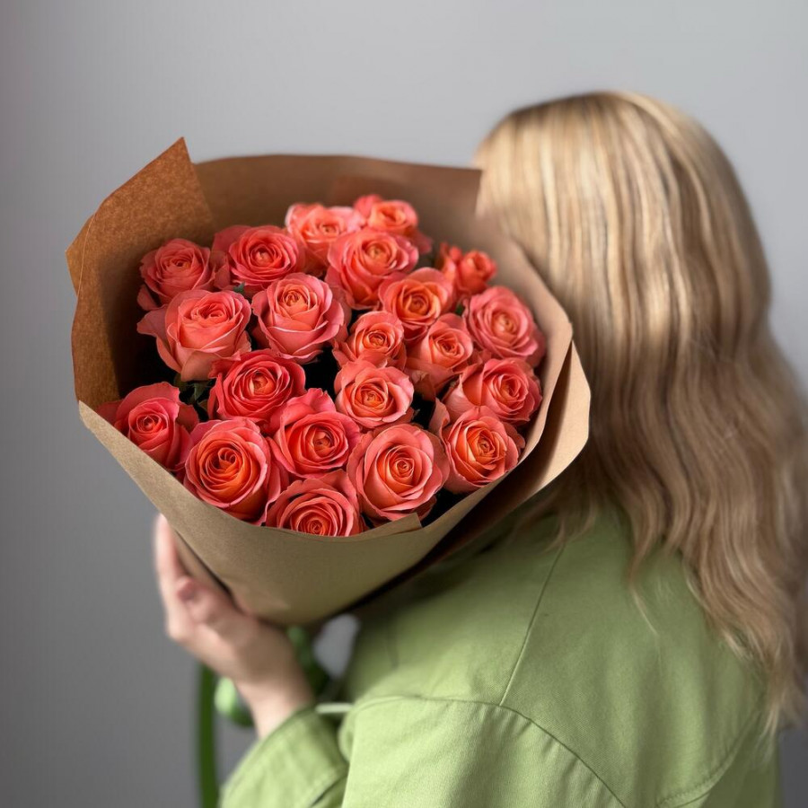 На фото букет из 21 оранжевой розы. В составе: роза 21 шт, крафт-бумага 2 шт, атласная лента 1 шт, . Все цветы свежие и ароматные, букет красиво оформлен и отлично подходит для подарка. Доступна доставка цветов или самовывоз.