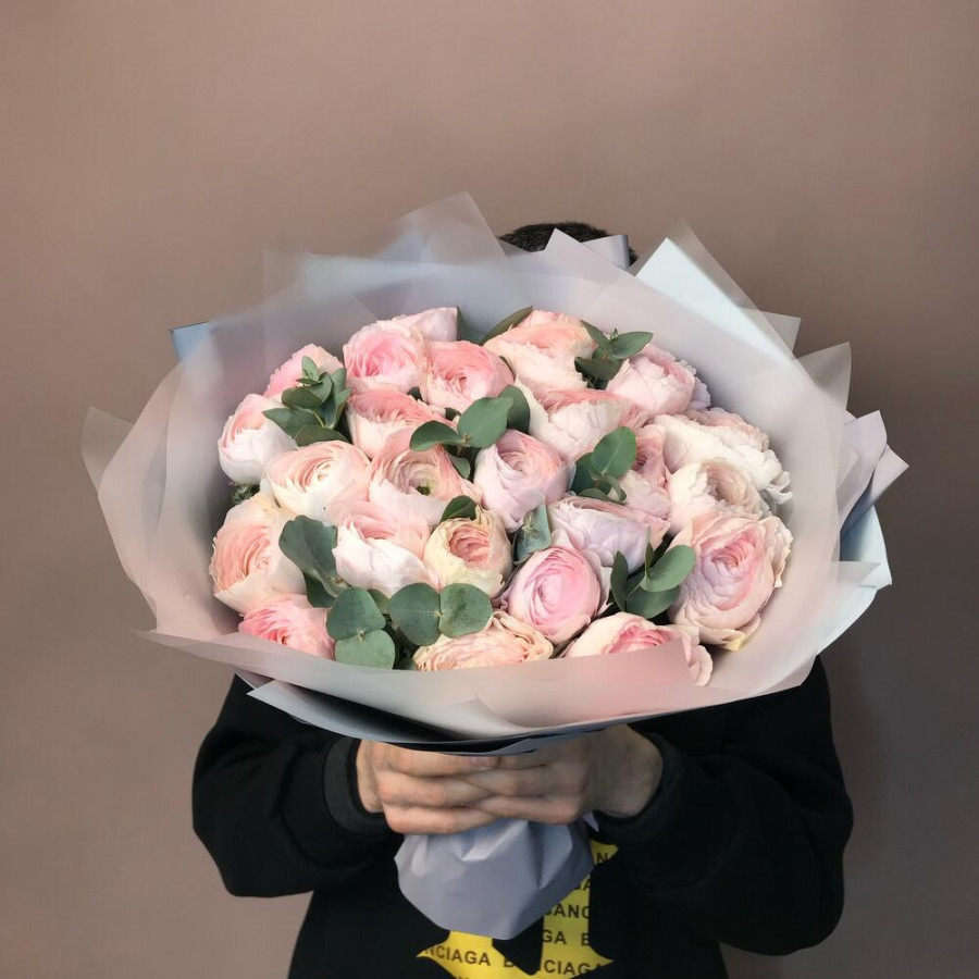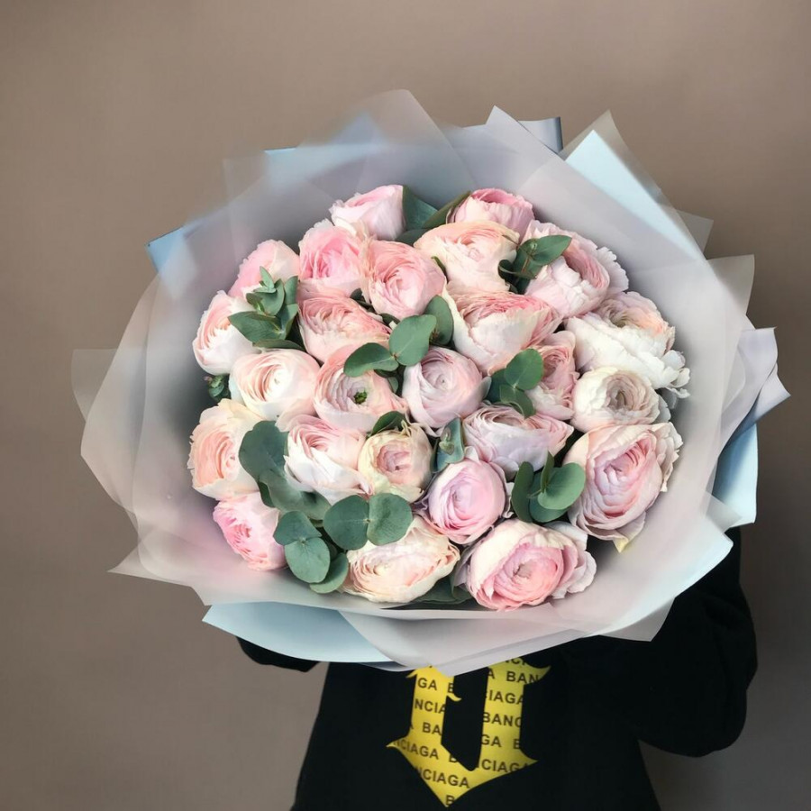 Букет из 29 розовых ранункулюсов с эвкалиптом