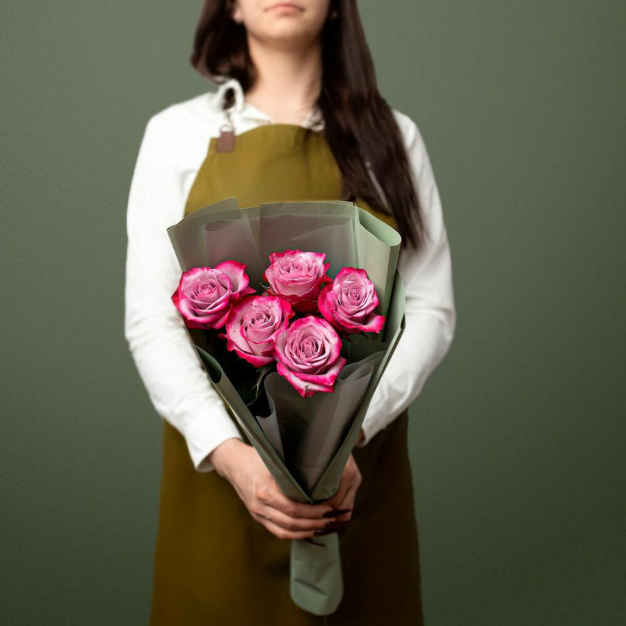 На фото букет из 5 фиолетовых роз. В составе: роза 5 шт, дизайнерская упаковка 1 шт, атласная лента 1 шт, . Все цветы свежие и ароматные, букет красиво оформлен и отлично подходит для подарка. Доступна доставка цветов или самовывоз.