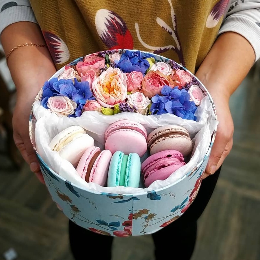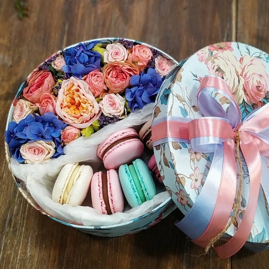 Букет из 5 макарон в круглой коробке, дополненный голубой гортензией и пионовидными розами, - это необычный и стильный подарок, который понравится любой женщине. Макароны - это маленькие пирожные, которые могут быть разных форм и цветов, что делает их универсальным украшением для любого букета. Голубая гортензия добавляет свежести и воздушности, а пионовидные розы - нежности и романтики. Такая комбинация цветов создает красивый и гармоничный букет, который будет долго радовать глаз своей красотой.
