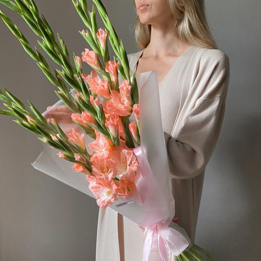 На фото букет из 7 коралловых гладиолусов. В составе: гладиолус 7 шт, дизайнерская упаковка 1 шт, . Все цветы свежие и ароматные, букет красиво оформлен и отлично подходит для подарка. Доступна доставка цветов или самовывоз.