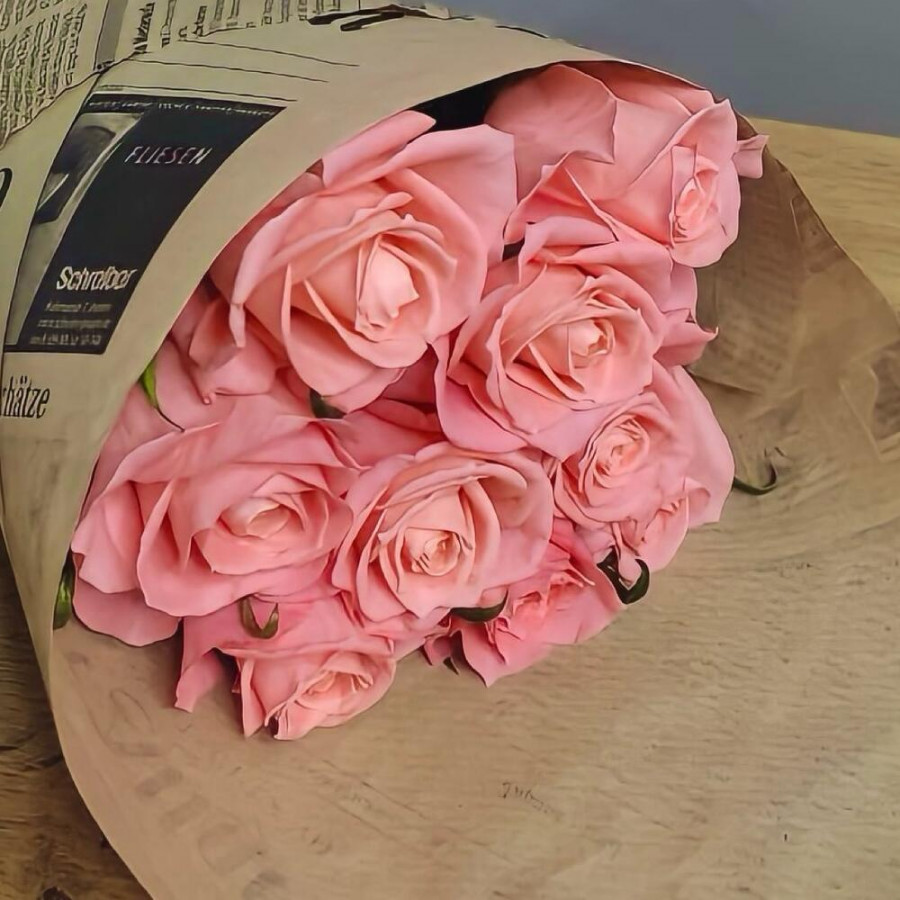 На фото букет из 9 коралловых роз. В составе: роза 9 шт, крафт-бумага 1 шт, атласная лента 2 шт, . Все цветы свежие и ароматные, букет красиво оформлен и отлично подходит для подарка. Доступна доставка цветов или самовывоз.