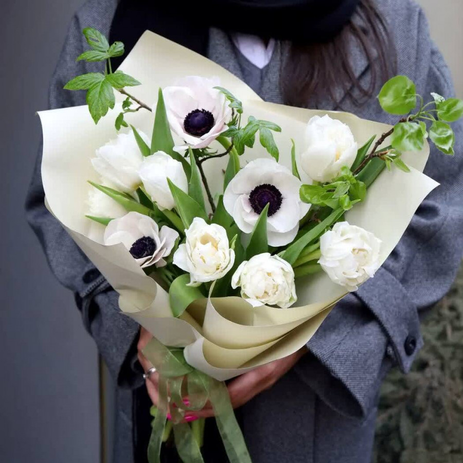 На фото букет из белых анемонов. В составе: анемон 3 шт, тюльпан 7 шт, крафт-бумага 1 шт, атласная лента 1 шт, . Все цветы свежие и ароматные, букет красиво оформлен и отлично подходит для подарка. Доступна доставка цветов или самовывоз.