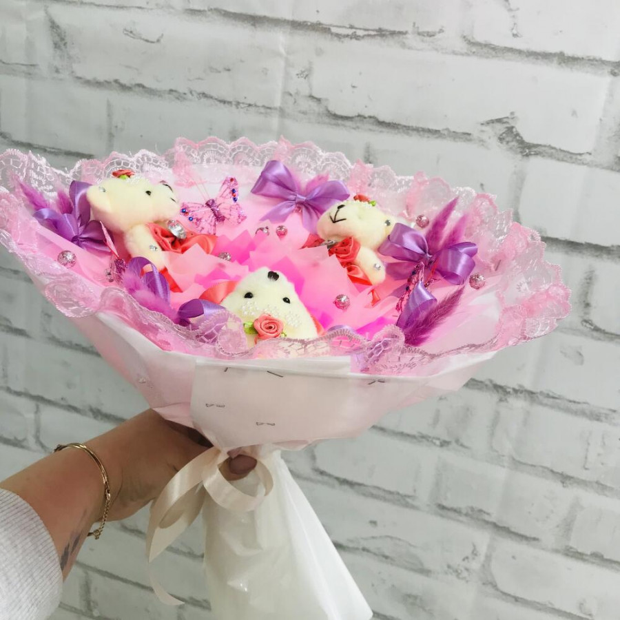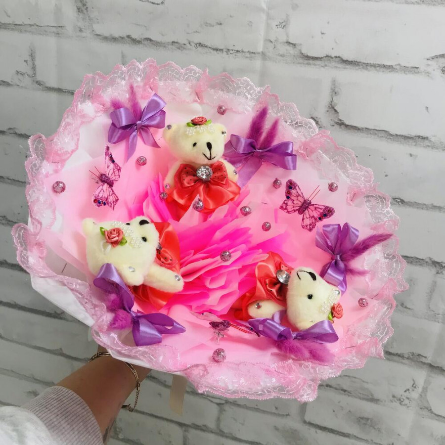 На фото букет из игрушек мишек и бабочек. В составе: . Все цветы свежие и ароматные, букет красиво оформлен и отлично подходит для подарка. Доступна доставка цветов или самовывоз.