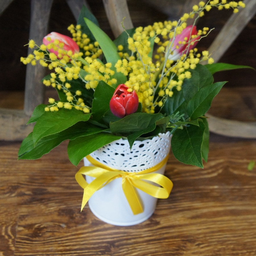 Заказывая данную композицию, Вы можете быть уверены – сердце Вашей избранницы будет покорено. Довольно простой, но выполненный с любовью дизайн, невероятно милая и яркая мимоза, нежнейшие тюльпаны и декоративные листочки салала обязательно затронут самые глубокие нотки женской души. Мягкий, свежий аромат наполнит комнату, и на протяжении долгого времени будет напоминать о том, кто сделал такой оригинальный сюрприз.