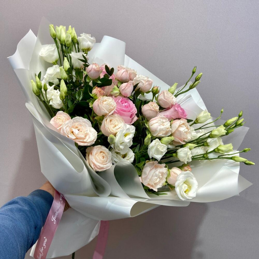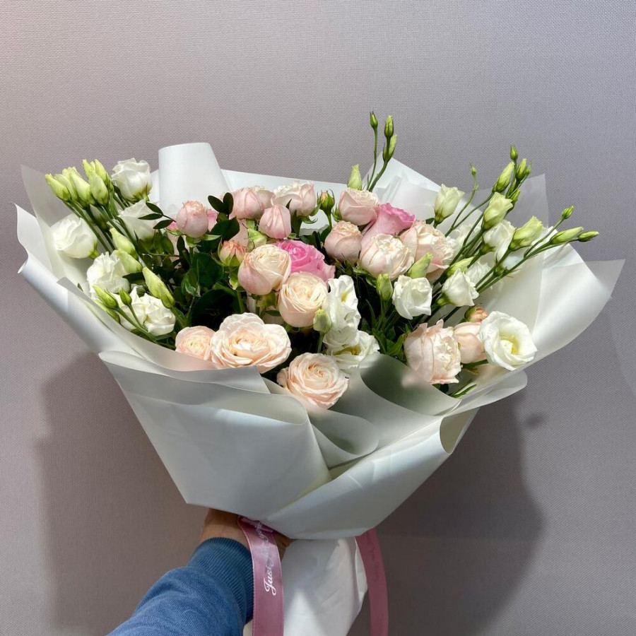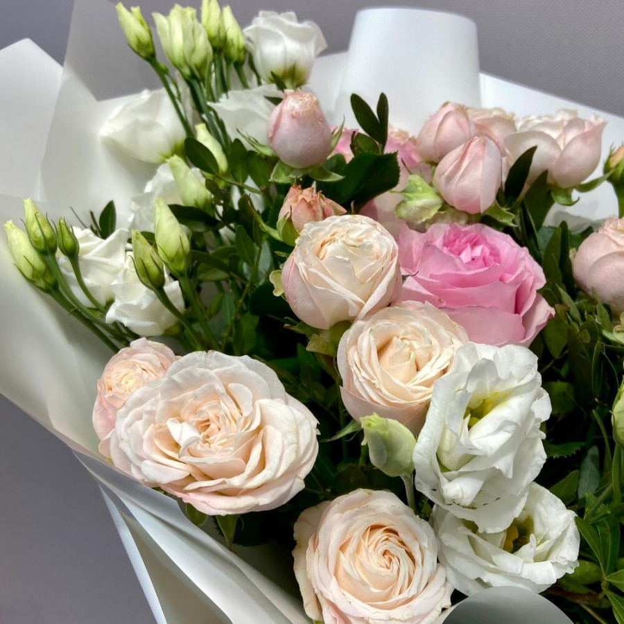 На фото букет из пионовидных роз и белых эустом. В составе: эустома (лизиантус) 3 шт, роза 3 шт, кустовая пионовидная роза 3 шт, писташ 7 шт, дизайнерская упаковка 1 шт, атласная лента 1 шт, . Все цветы свежие и ароматные, букет красиво оформлен и отлично подходит для подарка. Доступна доставка цветов или самовывоз.