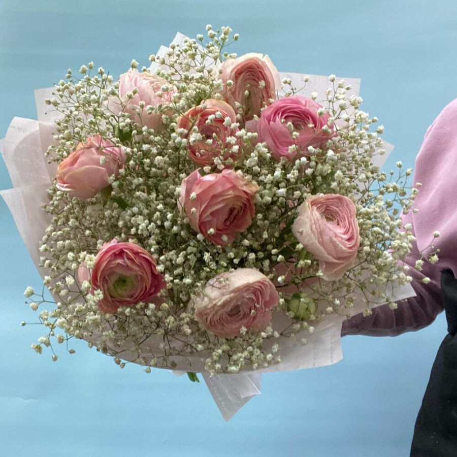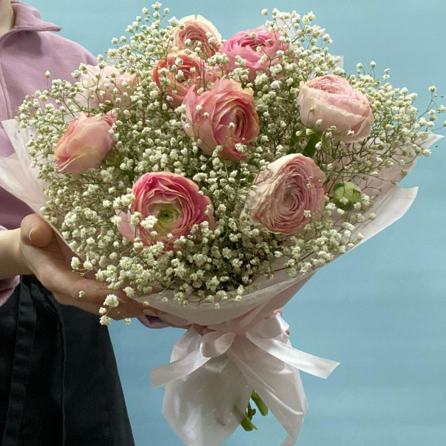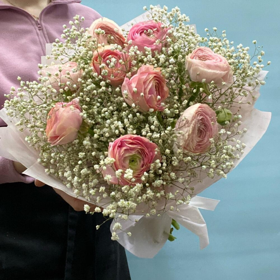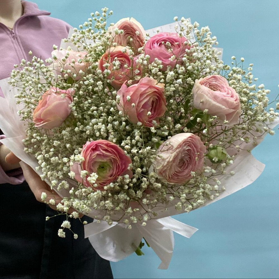 Букет из розовых ранункулюсов с белой гипсофилой в Пугачёве