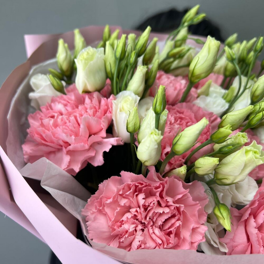 На фото букет «розовая нежность». В составе: гвоздика 10 шт, эустома (лизиантус) 3 шт, дизайнерская упаковка 2 шт, атласная лента 1 шт, . Все цветы свежие и ароматные, букет красиво оформлен и отлично подходит для подарка. Доступна доставка цветов или самовывоз.