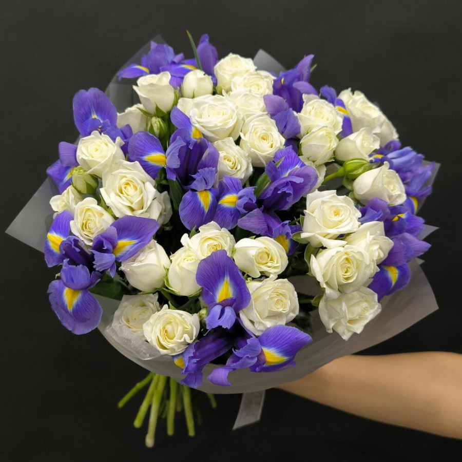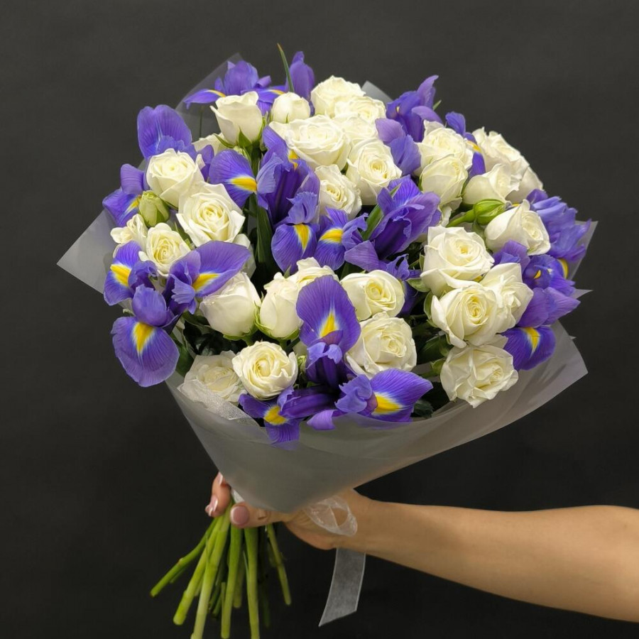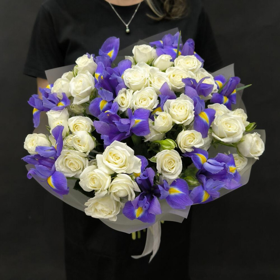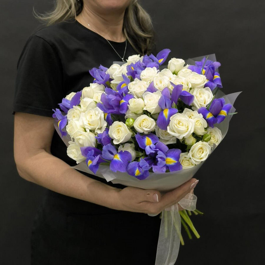На фото букет из синих ириcов и белой кустовой розы. В составе: ирис 14 шт, кустовая роза 7 шт, дизайнерская упаковка 1 шт, атласная лента 1 шт, . Все цветы свежие и ароматные, букет красиво оформлен и отлично подходит для подарка. Доступна доставка цветов или самовывоз.