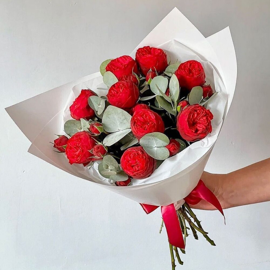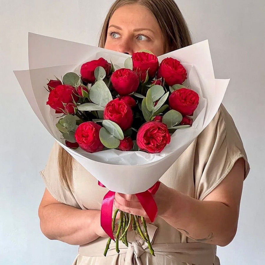 На фото монобукет из пионовидной розы. В составе: пионовидная роза 9 шт, эвкалипт 2 шт, крафт-бумага 1 шт, атласная лента 1 шт, . Все цветы свежие и ароматные, букет красиво оформлен и отлично подходит для подарка. Доступна доставка цветов или самовывоз.